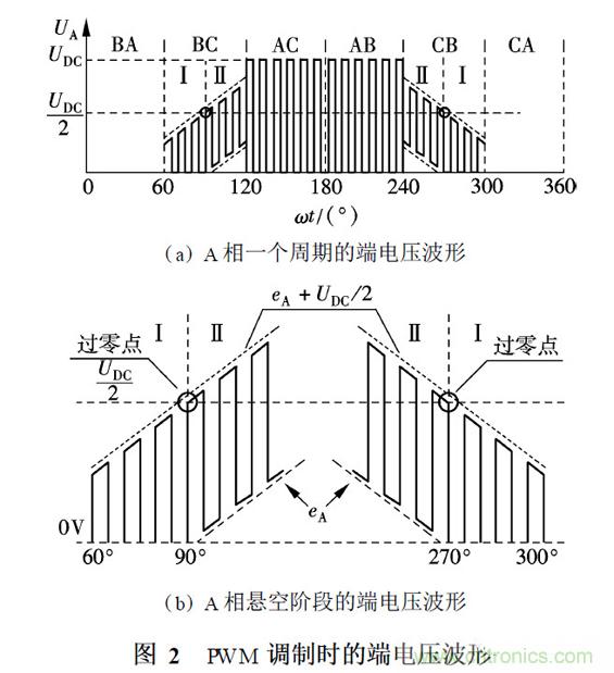 無(wú)刷直流電機(jī)控制可以采用多種PWM 調(diào)制方式. 采用的調(diào)制方式不同, 呈現(xiàn)的端電壓波形也不同. 本文采用上橋臂PWM 調(diào)制,下橋臂恒通(H _pwm 2L _on )的調(diào)制方式. 以A 相為例, 假設(shè)PWM 占空比為50% ,忽略高頻開關(guān)噪聲和換相續(xù)流產(chǎn)生的脈沖毛刺,理想的端電壓波形如圖2 ( a)所示. 在一個(gè)周期范圍內(nèi),將A 相端電壓波形劃分為BA, BC, AC, AB, CB 和CA 六個(gè)區(qū)域,每個(gè)區(qū)域?qū)?yīng)一個(gè)工作狀態(tài). 端電壓波形的上升部分和下降部分為BC區(qū)和CB 區(qū),此時(shí)A 相處于懸空狀態(tài).