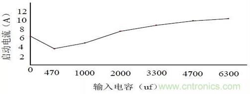 從理論上講,增大電路中的濾波電容 C容量的確可以使輸出電壓的波形變得更為平滑、起伏更小,但在電路接通瞬間,電路中所產生的沖擊電流因素卻不能被忽略;在一些濾波電路的維修中對濾波電容的替換也存在沖擊電流的問題,在不更換其他元件的前提下,單純提高濾波電容的容量會使整個電路的實際使用壽命大大縮短,甚至燒毀整個電路。況且,單純地提高濾波電容的容量對改善輸出電壓的作用也是有限的。做一個簡單實驗外接不同輸入電容的大小啟動時的電流曲線,如下圖所示為輸入外接電容大小與啟動電流的關系曲線。