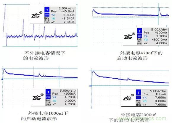 上圖為外接電容大小不同的啟動電流波形。外接電容在一定情況下,啟動電流達到最低值,對整個電路的輸入,輸出環境有很大的改善。當外接電容超過這個范圍就會導致啟動電流增大,對其他器件的威脅也就隨之增大,導致出現不同程度的器件損壞。