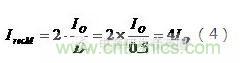流過輸出整流器的有效值電流與峰值電流的關系: