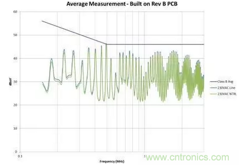 圖4是修改后的效果圖。我們在故障點位置為EMI規范獲得了大約6dB的裕量。此外,我們還顯著減少了總體EMI簽名。所有這些改善都僅僅是因為布局的調整,并未改變電路。如果您的電路具有高電壓開關并使用了屏蔽距離,您需要非常小心地對其進行控制。