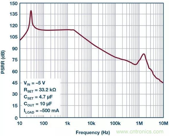 客戶使用運算放大器、ADC或其他信號鏈元件還將面臨另一個系統性能的難題:這些IC的電源抑制能力有限,更糟糕的是,高頻時的電源抑制能力可能會顯著降低。在過去,這意味著需要在電路板上使用額外的濾波元件,但這會增加解決方案的尺寸。此外,如果設計人員試圖獲得更高的精度,一旦穩壓器電源噪聲過高,則可能產生更多麻煩,這會導致測量場景出現不希望的變化。