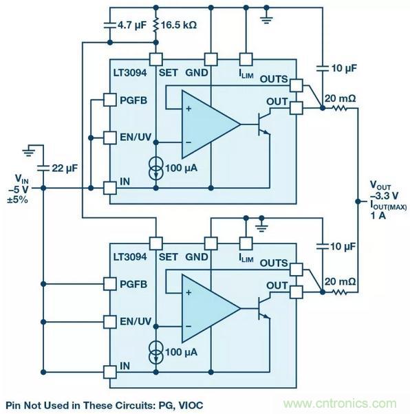 并聯多個LT3094可獲得更高的輸出電流。將所有SET引腳和所有IN引腳并在一起。使用小尺寸的PCB走線(用作鎮流電阻)將OUT引腳連接在一起,以均衡LT3094中的電流。也可以將兩個以上的LT3094進行并聯,實現更高的輸出電流和更低的輸出噪聲。輸出噪聲的降低與并聯器件數的平方根成比例。并聯多個LT3094對于在PCB上散熱也很有用。對于具有高輸入至輸出電壓差的應用,也可以使用一個輸入串聯電阻或與LT3094并聯的電阻進行散熱。圖4所示為并聯電路實現方案。