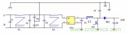 在0.15MHz~1MHz 的頻率范圍內,騷擾主要以共模的形式存在,在1MHz~10MHz 的頻率范圍內,騷擾的形式是差模和共模共存,在10MHz 以上,騷擾的形式主要以共膜為主。傳導發射的差模騷擾的產生主要是由于開關管工作在開關狀態,當開關管開通時,流過電源線的電流線形上升,開關管關斷時電流突變為0,因此流過電源線的電流為高頻的三角脈動電流,含有豐富的高頻諧波分量,隨著頻率的升高,該諧波分量的幅度越來越小,因此差模騷擾隨頻率的升高而降低,另外,如下圖1 所示,由于電容C5 的存在,它與電感L3 組成低通濾波器,因此,差模傳導騷擾主要存在低頻率段。