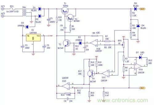 本電路設有反極性保護電路,由D4,U,U1D,T1及外圍元件構成,當電池反接時,充電器限制輸出電流不致發(fā)生事故。充電指示由U,D7及外圍元件構成,充電時,D7點亮,充電器進入浮充狀態(tài)后,D7熄滅,表示充電結束。