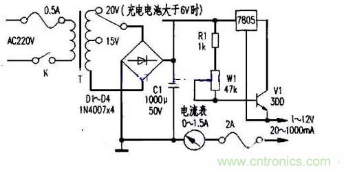 如圖所示,該電路由7805構成恒流源電路,通過大功率三極管進行擴流。