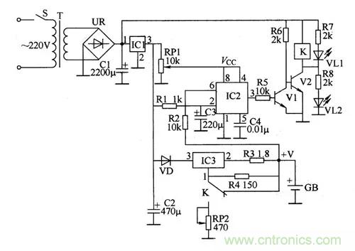 電源電路由電源開關S、電源變壓器T、整流橋堆UR、濾波電容C1、C2和三端集成穩(wěn)壓集成電路IC1組成;充電電路由二極管VD、三端可調穩(wěn)壓集成電路IC3、電阻R2~R4、電位器RP2和繼電器K的控制觸頭等組成;控制電路由時基集成電路IC2、電位器RP1、電阻R1、R5~R8、電容C3、C4、晶體管V1、V2、繼電器K和發(fā)光二極管VL1、VL2組成。
