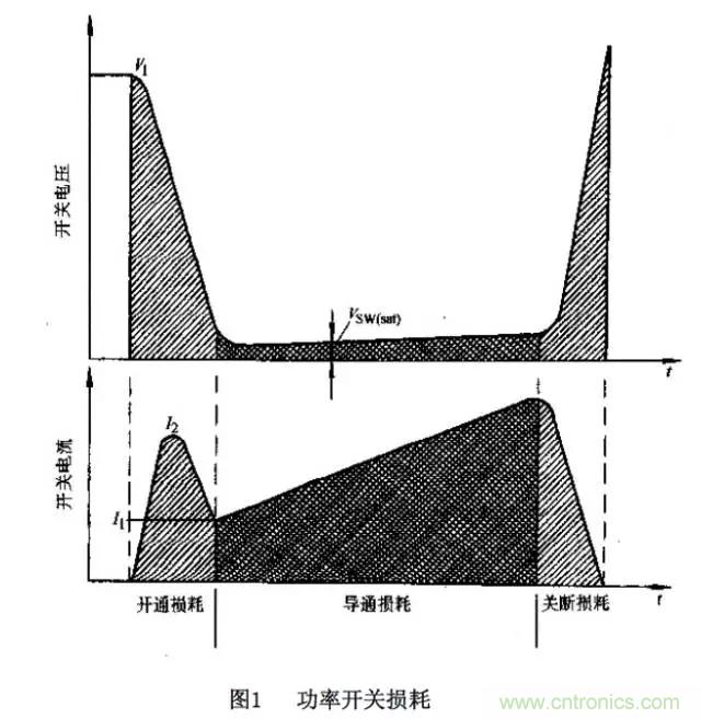 功率開關是典型的開關電源內部最主要的兩個損耗源之一。損耗基本上可分為兩部分:導通損耗和開關損耗。導通損耗是當功率器件已被開通,且驅動和開關波形已經穩定以后,功率開關處于導通狀態時的損耗;開關損耗是出現在功率開關被驅動,進入一個新的工作狀態,驅動和開關波形處于過渡過程時的損耗。這些階段和它們的波形見圖1。