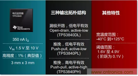 TPS3840擁有納米級的功耗與超高精準度,IQ僅為350nA,在保證了整套監控過程中的安全可靠以外,可延長電池使用壽命。
