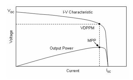 太陽能板輸出電流從小增大,基本保持輸出電壓Voc不變。在某一時刻,隨著輸出電流繼續增大,輸出電壓會快速下降,最終輸出為零。上圖為不同光照下不同的輸出V-I特性曲線。輸出功率等于電壓跟電流的乘積,從上圖可看出,某一時刻下,太陽能板輸出最大功率點(MPP)如下圖所示,出現在太陽能板輸出特性曲線的轉彎處,此時輸出電壓與電流乘積值最大。