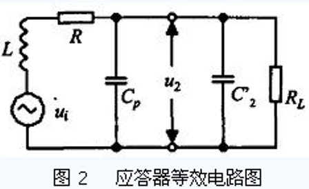 當(dāng)RFID 的線圈天線進入讀寫器產(chǎn)生的交變磁場中,RFID 天線與讀寫器天線之間的相互作用就類似于變壓器,兩者的線圈相當(dāng)于變壓器的初級線圈和次級線圈. 由RFID 的線圈天線形成的諧振回路如圖2所示,它包括RFID 天線的線圈電感L 、寄生電容Cp和并聯(lián)電容C2′,其諧振頻率為: