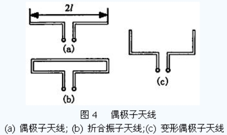 在遠距離耦合的RFID 應(yīng)用系統(tǒng)中,最常用的是偶極子天線(又稱對稱振子天線) . 偶極子天線及其演化形式如圖4 所示,其中偶極子天線由兩段同樣粗細和等長的直導(dǎo)線排成一條直線構(gòu)成,信號從中間的兩個端點饋入,在偶極子的兩臂上將產(chǎn)生一定的電流分布,這種電流分布就在天線周圍空間激發(fā)起電磁場.利用麥克斯韋方程就可以求出其輻射場方程: