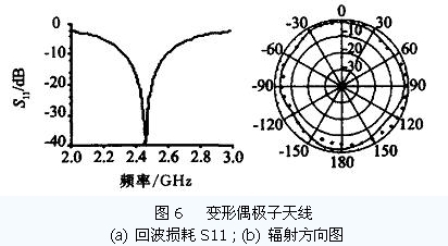從圖5b 可以看到在天線軸方向上,天線幾乎無輻射. 如果此時讀寫器處于該方向上,應(yīng)答器將不會做出任何反應(yīng). 為了獲得全方位輻射的天線以克服該缺點,可以對天線做適當(dāng)?shù)淖冃?如在將偶極子天線臂末端垂直方向上延長λ/ 4 成圖4c 所示. 這樣天線總長度修改為(57. 0 mm + 2 ×28. 5 mm) ,天線臂寬仍然為1 mm. 天線臂延長λ/ 4 后,整個天線諧振于1 個波長,而非原來的半個波長. 這就使得天線的輸入阻抗大大地增加,仿真計算結(jié)果約為2 kΩ. 其輸入回波損耗S11如圖6a 所示. 圖6b 為E 面(天線平面) 上的輻射場方向圖,其中實線為仿真結(jié)果,黑點為實際樣品測量數(shù)據(jù),兩者結(jié)果較為吻合說明了該設(shè)計是正確的. 從圖6b 可以看到在原來弱輻射的方向上得到了很大的改善,其輻射已經(jīng)近似為全方向的了. 電壓駐波比(VSWR) 小于2. 0 時的阻抗帶寬為12.2 % ,增益為1.4 ,對于大部分RFID 應(yīng)用系統(tǒng),該偶極子天線可以滿足要求.
