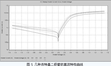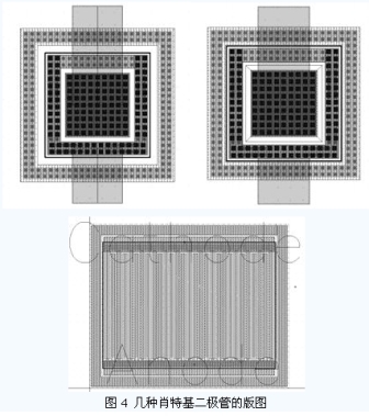 圖4 所示是在UMC 0.18um CMOS 工藝下設(shè)計的幾種肖特基二極管的版圖。它們的直流特性測試曲線如圖5 所示。從直流特性的測試結(jié)果