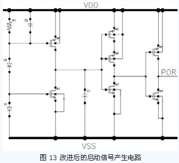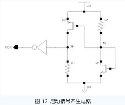 該電路仍然存在的靜態(tài)功耗的問題,可以通過增大電阻值,合理選擇MOS 管尺寸來降低靜態(tài)功耗的影響。要想完全解決靜態(tài)功耗的問題則需要設(shè)計額外的反饋控制電路,在啟動信號產(chǎn)生后關(guān)斷這部分電路。但是,需要特別注意引入反饋后產(chǎn)生的不穩(wěn)定態(tài)的問題。