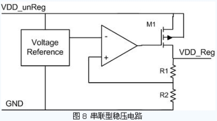 另外一類穩(wěn)壓電路的原理則是采用串聯(lián)式的穩(wěn)壓方案。它的原理圖如圖8 所示。參考電壓源是被設(shè)計成一個與電源電壓無關(guān)的參考源。輸出電源電壓經(jīng)電阻分壓后與參考電壓相比較,通過運算放大器放大其差值來控制M1 管的柵極電位,使得輸出電壓與參考源基本保持相同的穩(wěn)定狀態(tài)。