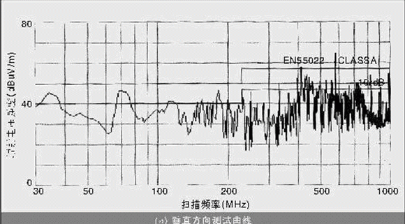 測試環境為電波暗室,測試設備為寬帶天線、頻譜分析儀和信號放大器,天線可以在1 m與4 m高度范圍內升降,被測產品放置在一個可360°旋轉的平臺上,距離天線3 m。測量時轉動平臺,升降天線找到最大干擾,天線測量取水平和垂直兩種極化。