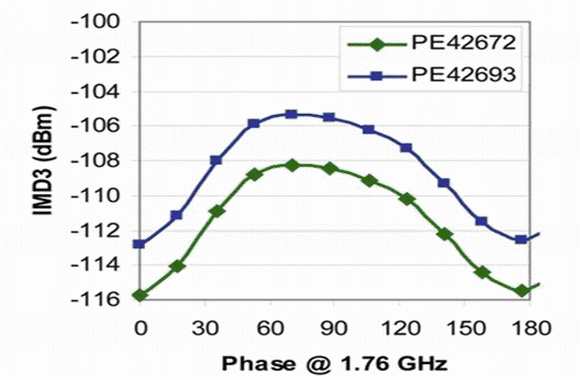 手機(jī)中增加的頻段越多,對(duì)開關(guān)的技術(shù)要求就越高,而且WCDMA的線性度和諧波要求對(duì)器件性能也帶來了很大的壓力。通過利用UltraCMOS制造工藝的線性優(yōu)勢(shì),圖2中的單片PE42693 SP6T可以保持其前代SP7T開關(guān)+68dBm的IP3,而且IMD3性能超過業(yè)界標(biāo)準(zhǔn)的-105dBm(圖1)。
