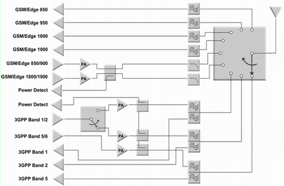 隨著多頻段架構(gòu)的普及,對(duì)功放和相關(guān)濾波器的數(shù)量提出了嚴(yán)格的要求。事實(shí)上,對(duì)功放的技術(shù)要求沒有變化,但手機(jī)設(shè)計(jì)需要使用更多的功放。因此真正改變的是需要一個(gè)特別高效的方法將所有射頻信號(hào)傳送給天線-單片開關(guān)。