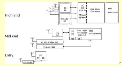 隨著多種無線技術標準在便攜無線設備中獲得應用,客觀上要求便攜式無線設備以有成本效益的方式支持多個頻段以及多種不同的調制方式。業內專家認為[1],目前多種無線標準在便攜式無線設備中的聚合將遵循入門級、中檔和高檔三種技術方案(圖1),采用CMOS數字無線電技術和可配置無線電技術是將來最終的解決方案。