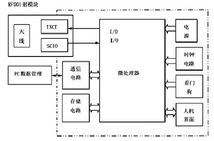 射頻識別系統主要硬件組成是由單片微處理器構成射頻信號的解碼模塊,其主要構成如下框圖,其中通過RS232串行通訊將數據交給PC機進行處理。