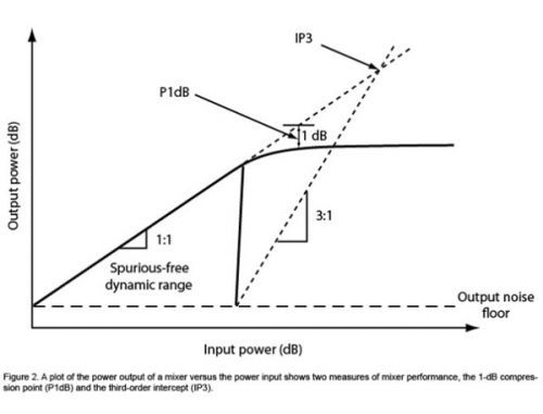 由于未能達(dá)到實(shí)際的IP3點(diǎn),因此IP3點(diǎn)是從IMD3獲得的理論值。混頻器的輸出級(jí)在達(dá)到IP3之前飽和。一般對(duì)于無(wú)源混頻器而言,高頻信號(hào)的IP3至少為P1dB以上15 dB,低頻信號(hào)的IP3至少為壓縮點(diǎn)以上10dB。