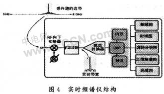 隨著數字射頻技術的發展,要求必須能捕獲并存儲一段時間的信號,并可反復回放,分析信號隨時間的變化。另外,隨著頻譜利用率不斷提高,干擾將來自更臨近的頻點,甚至同一頻率,這要求頻譜測試技術在發現和捕獲能力上實現本質性的突破。實時頻譜儀的核心是基于快速傅里葉(FFT)的儀表,可以實時捕獲各種瞬態信號,同時在時域、頻域及調制域對信號進行全面分析,滿足現代數字射頻信號測試的需求,圖4所示為簡化的實時頻譜儀結構圖。