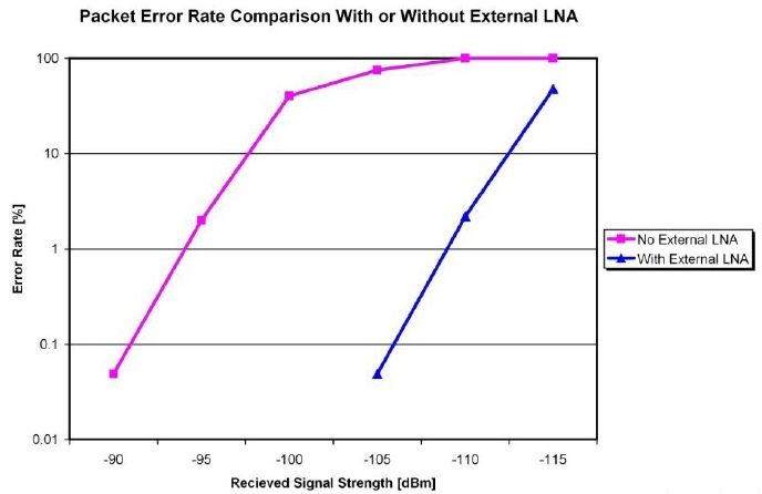 圖2:有/無外部LNA的低功耗無線接收機的誤包率對比。本例中實現了15dB的增益改善。