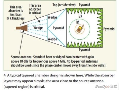 圖4:在典型的錐形暗室中,吸波材料的布局看起來(lái)很簡(jiǎn)單,但離源天線較近的區(qū)域(錐形暗區(qū)域)非常重要。