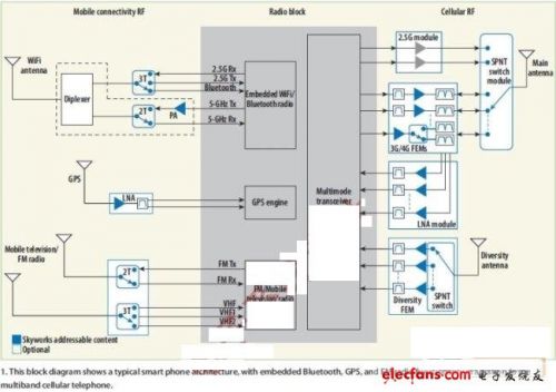 不管是通過蜂窩還是移動連接網絡和外部設備,為了確保高數據速率的無線通信,典型的智能手機(圖1)都集成有許多天線組件和多個無線數據流。放大、過濾和切換所要求的射頻信號需要用到多種射頻元件(圖中用藍色突出顯示了射頻開關部分)。