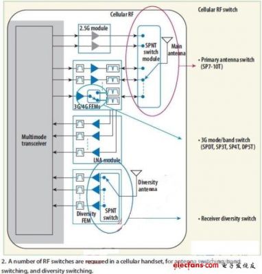 圖2:蜂窩手機中要求使用大量射頻開關,分別用于天線切換、頻段切換和分集切換。