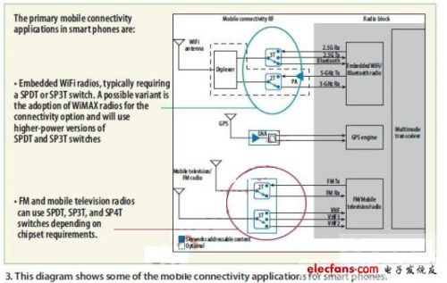 移動無線連接選件一般有兩種實現方式:使用分立元件和芯片組進行設計,或通過第三方模塊制造商提供。不管實現細節如何,在智能手機的移動連接側存在射頻開關的多種應用。