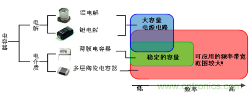 電容器有著各式各樣的種類。如圖1所示,電容器以生產材料可劃分為陶瓷電容器、鉭電解電容器、鋁電解電容器等。特別是多層陶瓷電容器,體積雖小但容量大,經常被用于去藕、電源電壓的平滑化、濾波等各種電路中。最近已成了提升手機、電視機性能所不可缺少的元件。