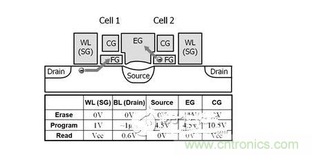 1 第3代SuperFlash存儲單元的結(jié)構(gòu)和典型工作條件。圖中給出了兩個共用源極和擦除柵極的單元。圖中用箭頭指示燒寫(單元1)和擦除(單元2)期間的電子轉(zhuǎn)移情況。WL為字線(選擇柵極),CG為耦合柵極,EG為擦除柵極,F(xiàn)G為浮置柵極。