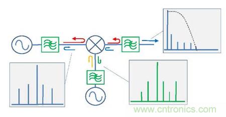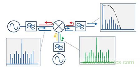 互調抑制一直是衡量混頻器設計的目標之一?;诋斍鞍雽w工業的發達,我們可以通過利用高動態范圍的場效應管成功實現了不同水平的互調抑制。然而,即使最好的混頻器也會在它的每個端口產生一些互調產物,并且這些互調產物會成為影響到周邊射頻鏈路中的因素。當傳統濾波器要濾除這些互調產物時,他們會被完全反射回到混頻器,并與基波信號重新合成而產生大量的假信號。這些假信號會因為可能落在所需的頻帶內而通過濾波器輸出到中頻,進而限制了整個系統的動態范圍。