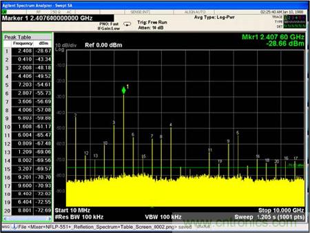 依照圖7所示測試電路,將測試3種不同狀態下從混頻器反射到源端的信號頻譜: