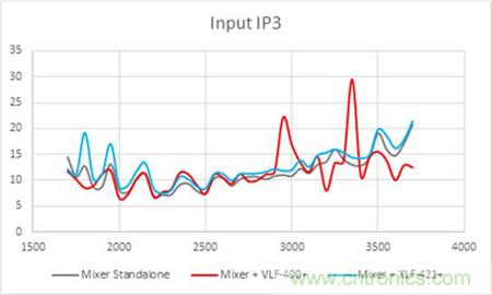 同樣的,在IP3的測試曲線也顯示了混頻器輸出端配對傳統濾波器后導致的不穩定曲線。而使用無反射式濾波器配對混頻器的輸出端則使得IP3性能與混頻器本身的IP3性能保持一致。