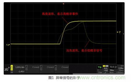 一般來說,異常信號概率較低,不同于正常信號,所以圖1中淺灰波形(低概率)很有可能就是我們要找的異常信號,但可惜的是,雖然看到了異常,但卻還不能查看其細節及做進一步分析,因為還欠缺將異常數據保存下來。