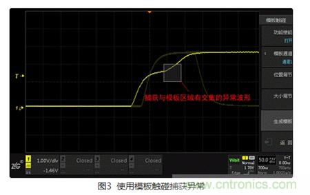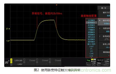 通過Step1,可以大概了解到異常信號的特性,將其特有的條件視為觸發條件,利用觸發可快速的捕獲異常信號。ZDS2000系列示波器免費標配了多種“觸發類型”,其中包括11種基礎觸發,21種協議觸發。另外,用戶還可根據波形的形狀特性,使用“模板觸發”,讓觸發更加隨心所欲。