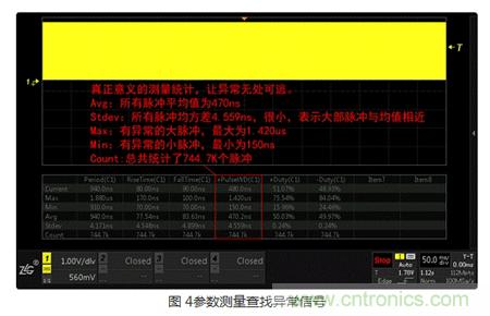 僅僅通過波形的直觀表現來分析異常信號遠遠不夠,只有將波形各項指標精確量化,才能看透波形異常的本質。ZDS2000系列示波器標配的51種“真正意義”的參數測量,會把屏幕上捕獲的所有波形進行統計分析,得出每一項的當前值、最大值、最小值、平均值、標準差、統計次數,用戶通過觀察最大值和最小值可快速了解波形中可能存在的異常,通過觀察平均值、標準差可快速評估信號特性。