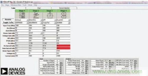 在為接收器設計設置級聯噪聲系數和截距模型時,你實際上需要為系統建模三次:一次針對最小信號電平,即最大增益下的AGC關閉電平;第二次針對最大信號電平,即最大增益衰減下的AGC開啟電平;最后一次針對接收器的標稱輸入電平。你還需要在所有三種模型中考慮交調效應。幸運的是,ADI的 ADISIMRF(圖1)等免費工具將助您一臂之力;這類工具通常內置適用于RF增益塊、混頻器、衰減器、巴倫、濾波器和高速轉換器的模型庫。