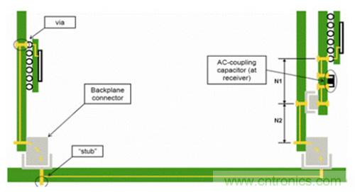 連接器④背板PCB走線⑤對側(cè)子卡連接器⑥對側(cè)子卡PCB走線⑦AC耦合電容⑧接收端芯片(封裝與PCB過孔)