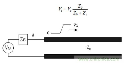 下圖描繪了加在長的傳輸線上的初始波形,初始的電壓Vi傳送到傳輸線上直到到達(dá)末端,Vi的幅度通過驅(qū)動器電阻和傳輸線阻抗的分壓來決定: