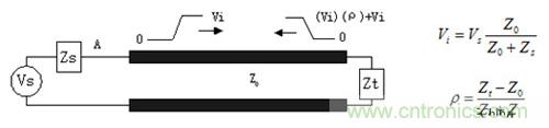 如下圖所示當(dāng)輸入波形遇到端接Zt,信號的一部分Viρ被反射回源端并且加在輸入波形上,整個輸入信號波形幅度為Viρ+Vi。反射的部分可能從源產(chǎn)生另一個反射,反射和逆反射一直持續(xù)直到傳輸線穩(wěn)定。