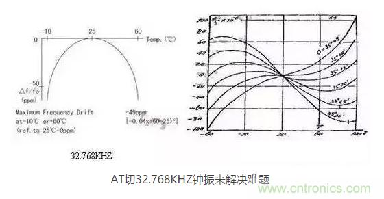 AT切晶體頻率溫度曲線為三次曲線,呈躺著的"S"型曲線,隨著溫度的變化,溫漂呈"S"型軌跡變化,大致在-10℃和+60℃時,有兩個"拐點",即溫漂又會反方向拐回來。因此,只要控制好晶片的切角在一定的公差范圍內,那么保證兩個拐點溫漂在-40℃~85℃時不超過±30ppm并不是一件難事。然而,AT切晶體只針對MHZ頻率的晶體,如何轉換成32.768KHZ頻率?鐘振32.768KHZ通過分頻方式,便可以實現。如采用AT切16.777216MHZ晶體,通過512分頻,那么就可以得到想要的32.768KHZ頻率。鐘振實現對頻率的分頻并不困難,都集成在振蕩IC內部。因此,使用AT切MHZ 分頻實現的32.768KHZ鐘振,在頻率溫度特性上,有很大的改良,在沒有進行溫度補償的時候,-40℃~85℃條件下,溫度頻差保持在±30ppm甚至±20ppm都是可以實現的。