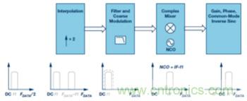 Tx鏈具有與Rx鏈相同的要求:需要高采樣速率以簡化濾波器設計,使信號頻率位于高中頻或直接變為射頻,以及遠遠地推開鏡像,但接口希望使用較低的數據速率。轉換器的集成DUC將解決這些要求。圖3是典型DUC的框圖。