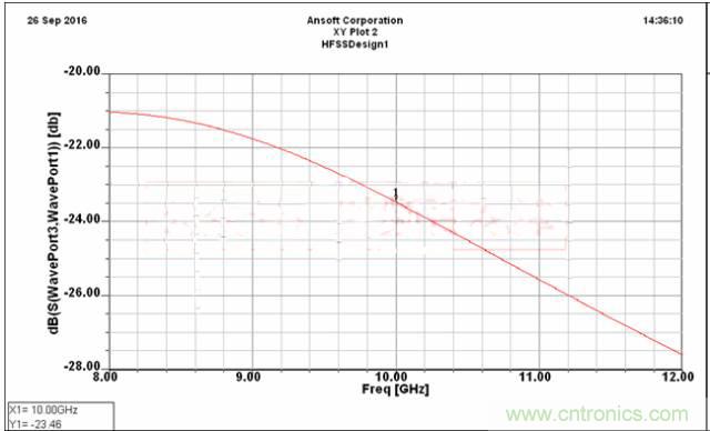 添加的C形環(huán)受到相同的磁場耦合,產(chǎn)生與主線相反的電流,從而對主線進行二次耦合,增強了主線的耦合度。仿真了1mm耦合間距的耦合度,仿真結(jié)果如下圖4所示。在10GHz耦合-18.72dB,x波段耦合度-17.25~-19.27dB,波動2dB左右。