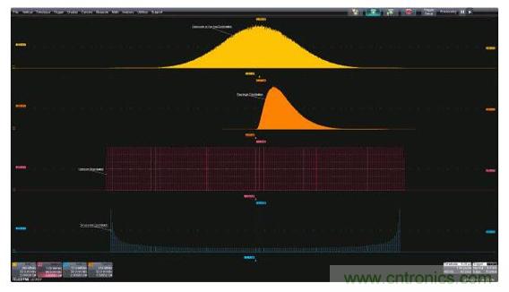 在許多應(yīng)用中,兩個(gè)或多個(gè)隨機(jī)過程可能發(fā)生交互。當(dāng)這種情況發(fā)生時(shí),過程的概率密度會(huì)進(jìn)行數(shù)學(xué)卷積運(yùn)算。一個(gè)常見的例子是結(jié)合了隨機(jī)和確定性抖動(dòng)分量的時(shí)序抖動(dòng)。圖5顯示了結(jié)合在一起的高斯和正弦分量,源分布位于上面兩張圖,從上往下數(shù)的第三張分布圖是兩個(gè)源卷積的結(jié)果。許多先進(jìn)的示波器提供可選的抖動(dòng)或噪聲分析包,這些分析包可以將這些組合式分布分開,單獨(dú)測量分量。