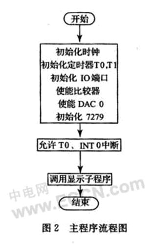 本系統采用C8051F060中的INT0中斷對轉速脈沖計數。定時器T1工作于外部事件計數方式對轉速脈沖計數;T0工作于定時器方式均工作于方式1。每到1 s讀一次計數值,此值即為脈沖信號的頻率,根據式(1)可計算出電機的轉速。由于直流電機的轉速與施加工于電機兩端的電壓大小有關,故將實際測得的轉速值與預設的轉速值比較,若大于預設的轉速值則減小DAC0的數值,若小于轉速預設的轉速值則增加DAC0的值調整電機的轉速,直到轉速值等于預設定的值,這樣就實現了對電機轉速的控制,主程序和T0中斷流程圖如圖2、3所示。