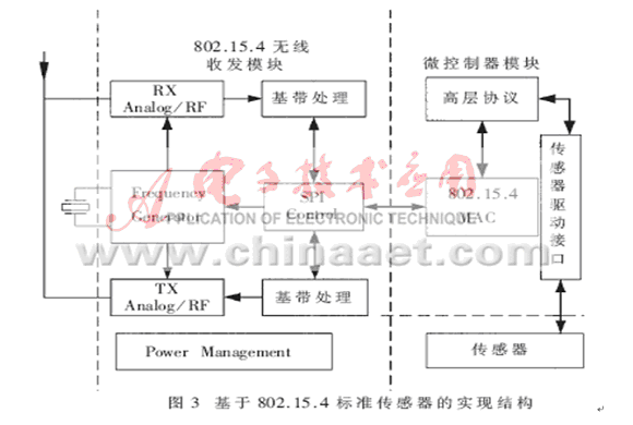 傳感器的實現機理是以802.15.4傳輸模塊代替傳統的串行通信模塊,將采集的數據以無線方式發送出去。其主要包括802.15.4無線通信模塊、微控制器模塊、傳感器模塊及接口、直流電源模塊以及外部存儲器等。